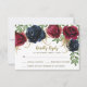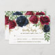 Tarjetas de RSVP de boda en Burgundy Rústico y Azul Marino - presentan elegantes rosas y peonías de acuarela en varios tonos de Marsala, burgundy, merlot y azul marino con follaje elegante. Hay toques de ramitas doradas en las flores y el follaje. La disposición de la fuente muestra colores de tinta dorada y bronce impresos para decoración adicional. Ver la colección coincidente en esta página para ver todos los productos coincidentes.