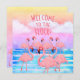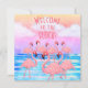 Tarjeta de saludo plana de Flamencos en Desfile. Una divertida invitación a fiesta para tu amante de los flamencos favorito. Naturaleza tropical, playa, aves, inspiración en animales. Arte acuarela para dar la bienvenida a la familia, adopción, entretenimiento, fiestas de cumpleaños u otros eventos. Mantén la cita humorística "¡Bienvenido al rebaño!", cámbiala y agrega tus detalles en el interior.