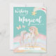Una tarjeta de San Valentín caprichosa para niños diseñada con una estrella mágica, arcoíris, unicornio, mariposas y brillo de oro falso.