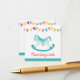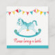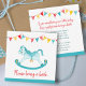 Hermoso caballo mecedora pintado a mano con estrellas y banderines gráficos, tarjetas de solicitud de libros para baby shower en aqua verde azulado, amarillo y rojo. Perfecto para solicitar libros con un mensaje personalizado dentro como regalo sentimental para tu nuevo bebé. Original pintura de acuarela de caballo mecedora caprichosa y diseño gráfico de Sarah Trett para www.mylittleeden.com en Zazzle.