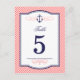 El diseño de la tarjeta de número de tabla boda prepar con un gráfico de anclaje náutico y un desplazamiento elegante de caligrafía florece sobre un fondo de rayas diagonales de moda. Utilice las herramientas de diseño para personalizar de fuentes, mover texto y crear su propio diseño único de invitación.