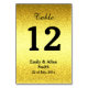 Tarjeta de tabla boda personalizada con texto de plantilla para un número, nombre y fecha; diseño retro dorado y amarillo con textura de círculos bokeh;