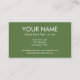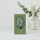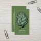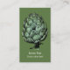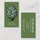 Una carta de negocios de huertas de alcachofa verde fresco con texto blanco sobre fondo verde.