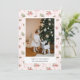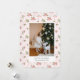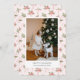 Tarjeta de vacaciones con un fondo de papel pintado pastel rosa y verde con una foto familiar junto con un saludo navideño y su nombre y año en una fuente sans serif.