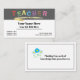 Plantillas de tarjetas de visita para profesores - esta tiene una parte delantera y trasera. Personalízalo para satisfacer tus necesidades. La parte delantera tiene un bonito aspecto de pizarra con el profesor escrito en tonos tiza sobre una "pizarra" con un trozo de tiza amarilla debajo. A continuación se puede agregar su información. La parte posterior contiene un pequeño diseño floral con mensajes inspiradores que puede actualizar si lo desea.