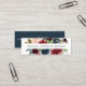 Las tarjetas de moda floral de negocios en un tamaño pequeño que ahorra papel incluyen tu nombre o nombre de compañía flanqueado por un borde superior e inferior de flores acuarelas pintadas en tonos de joyas de marsala de color burdeos, azul marino y rosa rubor, con follaje de eucalipto botánico verde. Añade tu información de contacto completa al dorso en blanco sobre azul naby rico.