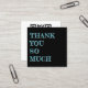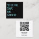 Pequeñas, negras, tarjetas de agradecimiento del cliente con plantilla de código QR. "Muchísimas gracias" es la letra en negrita en el frente en azul claro. La parte posterior de la tarjeta es blanca con el código QR y más texto. Incluya también el sitio web del negocio y/o cualquier otra información.