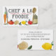 Las frutas, las verduras, el aceite de oliva, el cuchillo del cocinero y las tarjetas de visita de madera de la cuchara para las clases de cocina, el cocinero personal, el abastecedor o el abastecimiento, o el otro negocio gastrónomo del comida o culinario. Zanahoria, tomate, cebolla, vainas de guisante, limón, manzana en estilo de la acuarela con el texto intrépido.