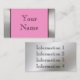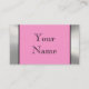 Una frontera metálica del marco de la mirada en cromo de plata liso de la mirada del acero inoxidable en el frente de la tarjeta con un fondo rosa claro da una tarjeta de visita de profesional-mirada de la mirada intrépida, única 3d. Fácilmente personalizar con su propia información. Utilice la fuente elegante negra dinámica mostrada o cambie fácilmente el estilo de fuente y coloréelo. También usted puede cambiar fácilmente el fondo rosado del color a cualquier color. Apenas haga clic en el "personalizar él" y después haga clic en "corrigen" y entonces "fondo" para cambiarlo. Una tarjeta de mirada única y elegante, especialmente grande para industrial, los diseñadores, los artistas, la venta al por menor, el etc. Más información se puede poner en la parte posterior también en el fondo metalizado liso de la mirada. El diseño se imprime en el papel, metal no real. Una tarjeta de visita fuerte que se destaca del resto.