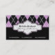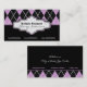 Las tarjetas de negocios de moda en el estilo de argyle blanco morado negro, con un patrón de argyle blanco y púrpura lila. La parte inferior es de color negro sólido. Las dos partes están separadas por una franja negra y una violeta. Su empresa/nombre está escrito en una elegante etiqueta de damasco con un contorno negro y rosa. Diseño moderno y cuidado con un toque retro que se puede utilizar en muchos campos de negocios como interiores, peluquería, moda y más.