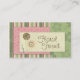 Perfecto para una tienda de flores o una tienda ecléctica, estas coloridas tarjetas de visita de Kustom By Kris presentan rayas poco brillantes, divertidos puntos de polka y una huella floral. Flores únicas de acento verde, rosa, marrón y naranja tanto en la parte delantera como en la trasera. Agregue su nombre comercial al frente y el lema o información adicional al reverso junto con sus datos de contacto. Haga clic en el botón Personalizar para cambiar el tamaño de las fuentes y mover el texto.