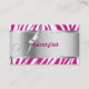 Las tarjetas de visita modernas del estilista con el fondo metálico de plata simulado, una cebra del rosa rayan el modelo, y el peluquero scissors. Personalice el texto en dos lados. Diseño fácil del estilo de la plantilla que usted puede alterar a su tener gusto. Las mejores tarjetas de visita para los salones de belleza, los peluqueros, los hairstylists, o el cortador independiente del pelo.