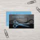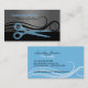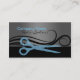 Esta tarjeta de visita única hace que un azul scissor el modelo con swirly un ilustracion del pelo en el frente y la parte posterior de la tarjeta. Personalice esta tarjeta con sus detalles. Su negocio del salón de pelo se destacará con este diseño de la diversión.