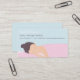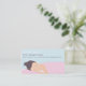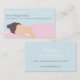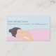 Una tarjeta de visita del diseño del vector con una señora que miente abajo cubierta con una toalla. Ella ha descubierto sus hombros en la preparación de una sesión de relajación del balneario y del masaje. El color de fondo azul en colores pastel ligero se elige para su efecto tranquilo, de relajación y que calma. Este diseño es grande para los negocios en la belleza, la salud, el balneario y la industria de la salud tal como terapeuta del masaje. Personalice fácilmente con sus detalles del negocio.