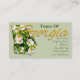 Aunque a veces se le llama el "Estado Imperio del Sur", el apodo oficial de Georgia es "Estado Peach". No es de extrañar. Georgia es el productor número uno de cacahuetes, pecanos y melocotones. El Rosa Cherokee, encantador y fragante, tiene un triste relato asociado con él. Un acontecimiento trágico, en 1838, en el que miles de cherokees fueron expulsados de Georgia y otras tierras al este del río Misisipi. El camino tomado por los nativos americanos ha sido llamado el "Camino de Lágrimas" debido a las lágrimas derramadas por las mujeres cherokees en el viaje y por la cantidad de nativos estadounidenses que murieron en el camino. Dicen que los jefes rezaron por un cartel para dar esperanza a sus mujeres. Se dice que dondequiera que una lágrima cayó, un Rosa cheroqui floreció. Las flores siguen floreciendo a lo largo del camino hoy. Georgia se convirtió en el cuarto estado en 1788. Como uno de nuestros estados "más viejos", es sorprendente que la canción estatal "Georgia On My Mind" (Georgia en mi mente) se adoptara en 1979 y la bandera oficial del estado recién se remonta al 2003. A pesar de su rica historia, buena y mala, Georgia es el hogar de una de las ciudades más contemporáneas del país: Atlanta. Atlanta también es el lugar de nacimiento de Coca-Cola. Este encantador diseño rinde homenaje a este hermoso estado. El contorno de estado está lleno de las hermosas flores blancas del Rosa Cherokee. Esto está recubierto de oro amarillo "Georgia". Estas preciosas tarjetas de personalizar son una excelente elección para Georgia Tour Guides, Georgia Travel Agencies o cualquier negocio relacionado con el turismo en Georgia.