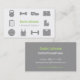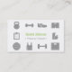 Una tarjeta de visita moderna, contemporánea, profesional y elegante con los iconos familiares de la aptitud en paleta de color gris y blanca. Incluyen el kettlebell, los pesos de la pesa de gimnasia, zapato de los deportes, los pantalones cortos, tablero en plan de la aptitud, botella de agua y manzana para simbolizar la hidración, dieta y nutrición, bola del gimnasio del ejercicio, camiseta del entrenamiento y escala de medición. Grande para los instructores personales independientes del gimnasio, instructores y cualquier persona de la aptitud en la industria de la salud y de la aptitud. Personalice fácilmente con sus detalles del negocio.