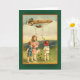 ¿Ilustracion irlandés lindo del arte de niños en un campo, con un dirigible (zepelín? dirigible no rígido?) de arriba, dispersando tréboles a través del paisaje. Envíe los saludos del día de St Patrick a los amigos y a la familia, o añada el texto para crear la tarjeta de cumpleaños del día de un St Patrick personal o el otro saludo.