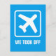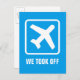 Tarjetas divertidas de reubicación o cambio de dirección. Tarjetas modernas y lindas para nuevo hogar o negocio. ¡Despegamos! Letrero de logo de aeropuerto de avión con texto personalizado. Agregue su cambio de dirección en la parte posterior. Icono de avión divertido para nueva casa o empresa reubicada. ¡Nos hemos mudado! Tema de viaje.