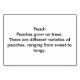 Estos flashcards incluyen un cuadro de un melocotón maduro, amarillo y rojo con una hoja verde. Uno de los lados opuestos es el texto que dice: "Los melocotones crecen en los árboles. Hay diferentes variedades de melocotones, que van desde dulces hasta anaranjados". El texto es fácil de personalizar en el formulario de plantilla. Gracias por comprar tarjetas CustomFlashCards en Zazzle por leer tarjetas flash para adultos. Solía ser un profesor de alfabetización para adultos, y este tipo de tarjetas flash hubieran sido muy útiles.