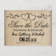 Tarjetas postales de ahorro de fecha con doble corazón vintage de campo rústico con un fondo de madera desgastada y deslucida. Tiene dos corazones entrelazados en la parte superior con acentos florales. Estas son perfectas para una boda de campo rústica.