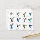 Tarjeta postal única que presenta varias especies pintadas a mano de colibríes principalmente tropicales como el colibrí mango, el colibrí coronado púrpura terciopelo, el colibrí de garganta azul, el colibrí zafiro de cola dorada, el colibrí frente de estrella oscura y el colibrí oreja violeta mexicano entre otros. Imágenes tomadas de mis pinturas originales en acuarela.