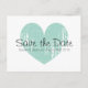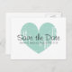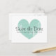 Tarjetas postales de corazón azul turquesa para guardar la fecha de la boda. Símbolo de amor desgastado vintage con texto de escritura elegante para nombres de novia y novio más fecha. Diseño de ilustración romántico lindo personalizado con su mensaje para los invitados. Color de fondo personalizable, es decir, blanco. Impresión rústica de estilo campestre para fiesta de matrimonio elegante.