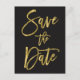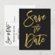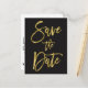 Tarjetas postales de guardar la fecha de boda negras con efecto de lámina dorada (falso, impreso como una imagen) y texto personalizado impreso sobre fondo blanco