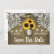 Tarjetas Postales de Mason Jar Girasoles Rústicos para Guardar la Fecha: presentan un fondo único de madera de granero con encaje elegante y luces de hadas. Este diseño también presenta un frasco de mason lleno de girasoles y aliento de bebé. El frasco de mason está decorado con iniciales que puedes cambiar por las de tu elección.