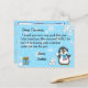 Copos de nieve blancos y azules, con un adorable pingüino festivo lanzando una bola de nieve y una carta personalizada de Papá Noel en la parte delantera. La parte trasera tiene un espacio para que tu hijo escriba su lista de deseos de Navidad.