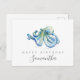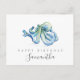 Una tarjeta postal de felicitación de cumpleaños en acuarela que envía amor y deseos desde lejos. Este diseño simple presenta mi original pulpo azul pintado a mano en acuarela con "Feliz Cumpleaños" en una tipografía moderna y el nombre del destinatario en tipografía de letra manuscrita. Utilice los campos de la plantilla para agregar su información personalizada y saludo personalizado. Una elección náutica y sofisticada para deseos de cumpleaños. Diseñado por Victoria. Para ver más tarjetas postales de pulpo de estilo playero, visite www.zazzle.com/vginvites