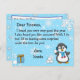 Copos de nieve blancos y azules lindos, con un adorable pingüino festivo tirando una bola de nieve y una carta personalizada de Santa Claus en la parte delantera. La parte trasera tiene un lugar para que su hijo escriba su lista de deseos de Navidad.