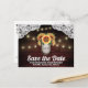 Tarjetas Postales de Tarjeta de Ahorro de Fecha de Girasol en Tarro de Mason de Madera - Invitaciones de Boda de Madera de Tarro de Mason de Girasol - cuentan con un fondo de madera de granero rojo intenso recortado con encaje y decorado con luces centelleantes de cuerda de color cálido. El diseño también cuenta con un ramo de girasoles dentro de un tarro de mason que puedes personalizar con las iniciales de tu elección.