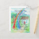 La pintura muestra un hogar con un poema inspirado en el Puente del Arcoíris para el duelo de las mascotas. El texto del poema es "Adiós por ahora, tenemos un cuerpo por un poco de tiempo en esta Tierra. Mi espíritu es como el tuyo y nunca morirá. Esperaré por ti al otro lado del Puente del Arcoíris. Hasta entonces, nuestro amor nos une a través de nuestros recuerdos de alegría de nuestro tiempo juntos aquí. El amor vive siempre. Arte y Poema de Laurel Latto © 2016". Puedes personalizar esta tarjeta postal de duelo de mascotas con tus propias opciones. El Puente del Arcoíris se considera el puente especial del amor y la luz que las almas de las mascotas cruzan hacia el cielo cuando dejan sus cuerpos terrenales. Es un recordatorio de que sus almas siguen viviendo en Espíritu, por lo que nunca están muertas, solo son diferentes de su tiempo en la Tierra