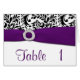 Las tarjetas púrpuras del número de la tabla de la recepción nupcial del damasco - cree una tarjeta para cada tabla en su recepción nupcial para tomar medidas del asiento más fáciles en sus huéspedes. Cada tarjeta ofrece una impresión del damasco con una cinta impresa púrpura con un adorno redondo de la hebilla del diamante.