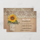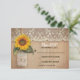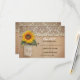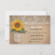 Sótano rústico de madera antigua, encaje vintage de marfil y bonito frasco de albañil con flor de girasol colgado en la cuerda - perfecto tarjetas RSVP de boda para el tema de la boda rural con acentos de albañiles y girasoles.