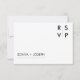 Mantenga los detalles de su boda sencillos y elegantes con estas minimalistas tarjetas RSVP. Diseñadas con líneas depuradas y tipografía moderna, son el complemento perfecto para un boda contemporáneo. Los clientes pueden responder con facilidad apreciando el estilo atemporal y sofisticado. Personalice los nombres, la fecha del boda y las opciones de respuesta para que coincidan con el tema del boda sin esfuerzo.