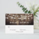 Tarjeta RSVP de boda rústica de campo con fondo de madera de granero adornada con corazones de abalorio y luces de cuerda que coronan la fecha de respuesta deseada y redacción de aceptación y declinación del personalizado.