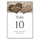 Rústico número de mesas de burlap y boda de encaje con dos corazones burlap contra un fondo de burlap y encaje adornado con luces de cuerdas. Plantilla fácil de personalizar.
