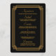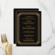 Las cartas del menú están decoradas con una paleta de colores negro y dorado, un marco geométrico y otros detalles estilísticos inspirados en el Art Deco y los años 2000. Puede personalizar de los campos de texto de ejemplo a su gusto.