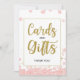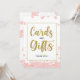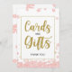 Este moderno cartel floral de "Tarjetas y Regalos" con ducha de novia cuenta con un fondo floral rosa con salpicaduras de purpurina dorado. El texto está escrito en una mezcla de un tipo de letra de caligrafía lúdica y un tipo de letra sans moderno.