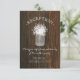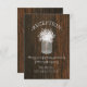 Una tarjeta de recepción de boda rústica y elegante que presenta una ilustración de un tarro de mason con aliento de bebé sobre un fondo inspirado en madera de granero.