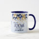A stylish 100th birthday mug . Design features navy blue and gold balloons, Gold glittery starts and navy blue text all on a pale blue gradient background. A lovely gift for a 100th birthday party celebration. Easy to customize with your own details.