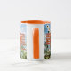 Este tazón de dos tonos muestra un diseño que presenta un tipo de letra Saira Condensed impresa con letras verdes y un contorno de color naranja que presenta el versículo de la escritura bibliográfica "1 John 3:8" de KJV sobre esta imagen con una vista superior de un campo de flores con pétalos blancos de tallo verde bajo un cielo azul claro nublado en el fondo de este tema basado en la fe. Este verso hace referencia al tercer capítulo del Libro de 1 Juan que muestra el octavo verso de esta escritura biblia, el tema de la cita de la Biblia del Rey James. La llanta y la manecilla están acristaladas con colores a juego disponibles en la construcción de cerámica de microondas y lavavajillas de 11 onzas o 15 onzas.