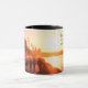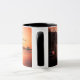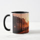 El tazón de café con inspiradora cita de las escrituras cristianas representa una fotografía con el sol poniéndose sobre el agua y cuatro amigos caminando sobre el muelle. Presenta una parte de la Biblia Verse 1 Tesalónica 5:11, "Alentarse unos a otros y construirse unos a otros".