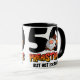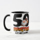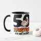 50.o diseño divertido del cumpleaños con el hombre de las cavernas sonriente del dibujo animado que sostiene un club y una antorcha. El texto dice 50 PREHISTÓRICOS PERO NO EXTINTOS. Fondo apenado. Personalícelo con su propio texto de encargo. ¡Original de PinkInkArt!
