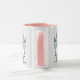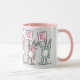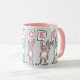 Divertida taza para alguien con un nombre de 6 letras. Mugre rosa y blanco con ilustracion de conejos en rosa y azul. Los conejos están sosteniendo tarjetas para deletrear el nombre. El nombre de ejemplo es Darcee. Conejos pequeños.