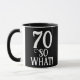 70 Así que qué gracioso cita 70 años de la Mug Negra. Tipografía blanca moderna sobre un fondo negro. Una gran idea de regalo para alguien que celebra el 70 cumpleaños. Viene con una cita graciosa de que tengo 70 años, así que qué y es perfecta para una persona con sentido del humor.