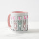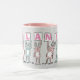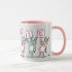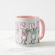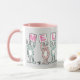 Mug de diseño de conejo divertido para alguien con un nombre de 7 letras. Rosa divertida y Mug blanca con ilustracion de Conejos en rosa y azul. Los conejos están sosteniendo tarjetas para deletrear el nombre. El nombre de ejemplo es Melanie. Conejos pequeños.
