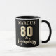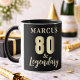 Taza de cumpleaños 80 & Legendario Oro 80. Celebre el cumpleaños 80 con esta elegante taza personalizable. Con un texto en tono dorado metálico '80 & Legendario', este diseño está listo para que lo personalice con el nombre. Es el regalo perfecto para honrar a un padre, abuelo o amigo querido que alcanza este increíble hito. Esta taza es ideal para fiestas de cumpleaños.