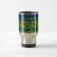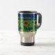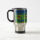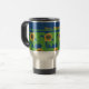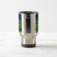 Una taza brillante, atractiva del viaje a modificar para requisitos particulares, con un modelo de girasoles amarillos de oro en un fondo azul profundo, de una serigrafía de Judy Adamson.